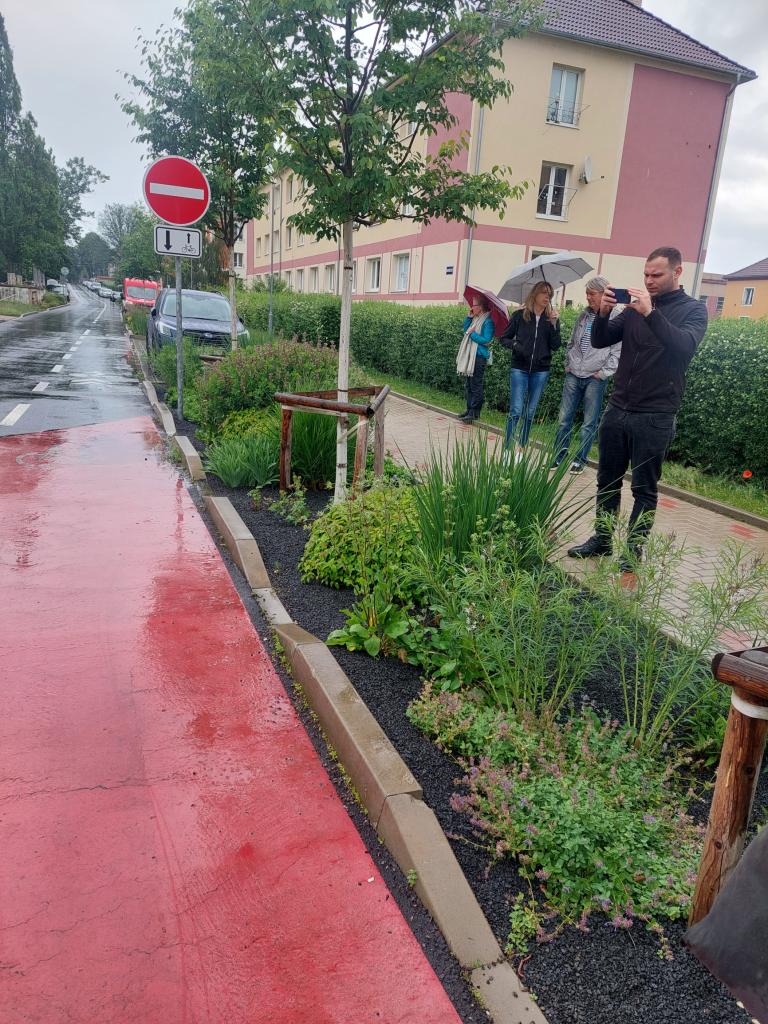 Díky deštivému počasí, které exkurzi provázelo, mohla krajinářská architektka Martina Imramovská zástupcům obcí ukázat funkčnost extenzivních štěrkových záhonů a dešťových záhonů.